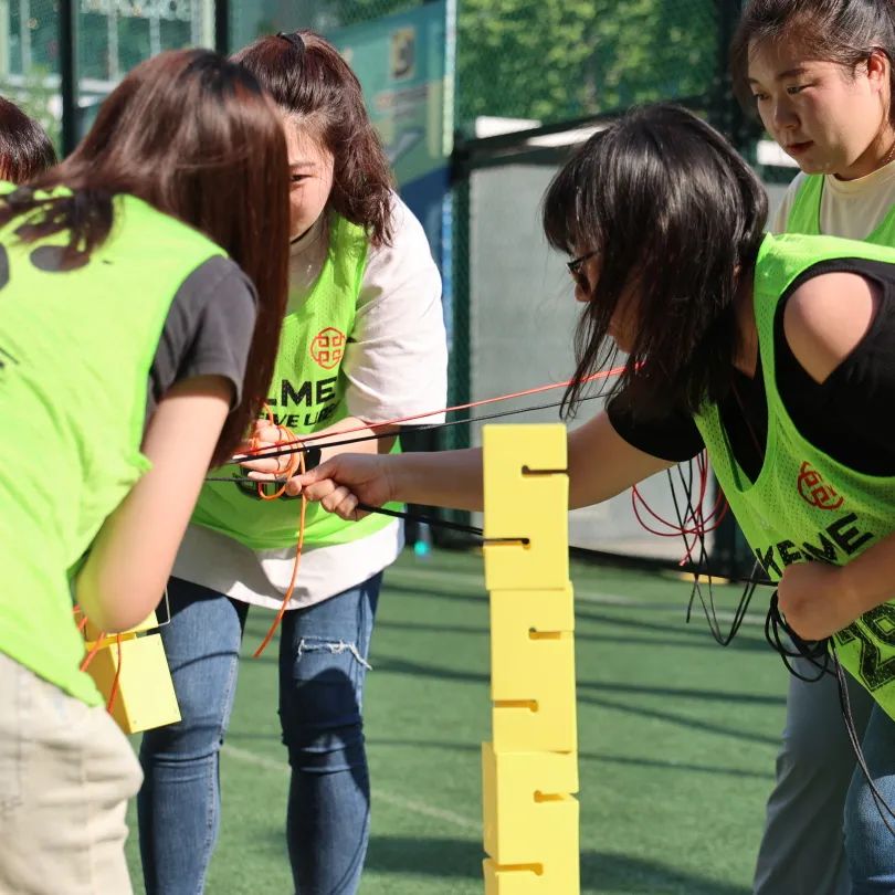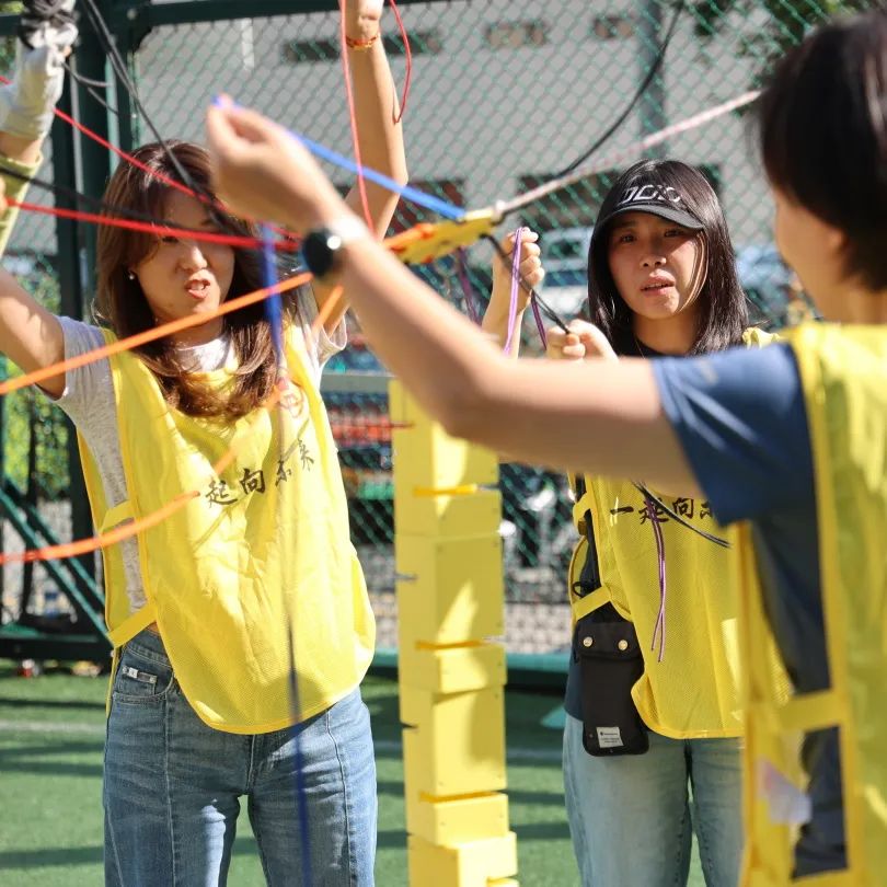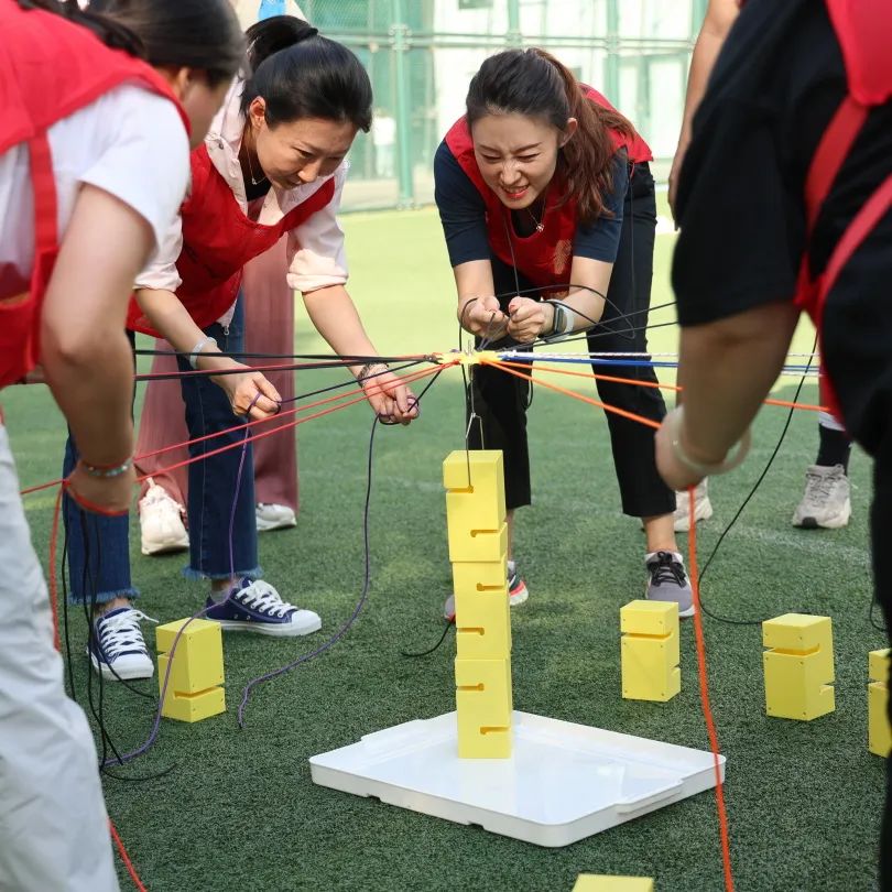 活动在太阳成城集团足球场举行,女员工们身着鲜艳的队服,自动组成8支小队。在各自队长的带领下,分别取了妙趣横生又斗志昂扬的队名,并进行三组别开生面的团队挑战。“合力搭建”需要所有队员通过手拉绳子控制吊板,在5分钟内搭建积木结构;“重走长征路” 需要所有队员通过平衡长征路线地图,使小球穿越所有长征根据地而不掉落;“一圈到底”要求队员们手拉手站成一排,将呼啦圈快速从第一个队员传递到最后一名队员并返回。三个游戏不仅都需要团队协作和默契,还需要沉稳和耐心。