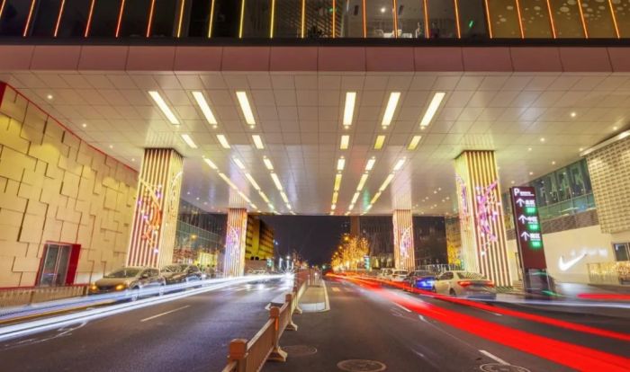 ×÷Ϊ̫Ñô³É³Ç¼¯Íų¤°²½ÖÑØÏßµÄÖ÷µã룬ÄÏ´óÃÅÕûÌ嵯¹âÒÔ½ðɫΪÖ÷É«µ÷À´ÌåÏÖ¡°½ðÊ®×Ö¡±Õâ¸öÖ÷Ì⣬ͨ¹ýµÆ¹âµÄÃ÷°µ±ä»¯Õ¹ÏÖ³ö·á¸»µÄ²ã´Î¸Ð£»¶¥²¿²ÉÓý¥±äµÄȾɫµÆ½øÐÐÉ«²ÊÔÎȾ£»Á¢Ãæ²£Á§ÊÎÓнðÉ«ÒÕÊõÏßÌõ£¬ÓëÁ÷¶¯µÆ¹âÏ໥ӳ³Ä£¬·Â·ðÁúÔÚÌÚ·É£¬ÏÔµÃÆøÊÆ·Ç·²£»Áù¸ùÁ¢ÖùÒÔ½ðÉ«ïοջ¨ÎƽðÊô×°Êΰü¹ü£¬ÄÚÖýðɫůɫµÆ¹â£¬ÕûÌå³ÊÏÖÁ÷¹âÒç²ÊµÄ½ÚÈÕЧ¹û¡£