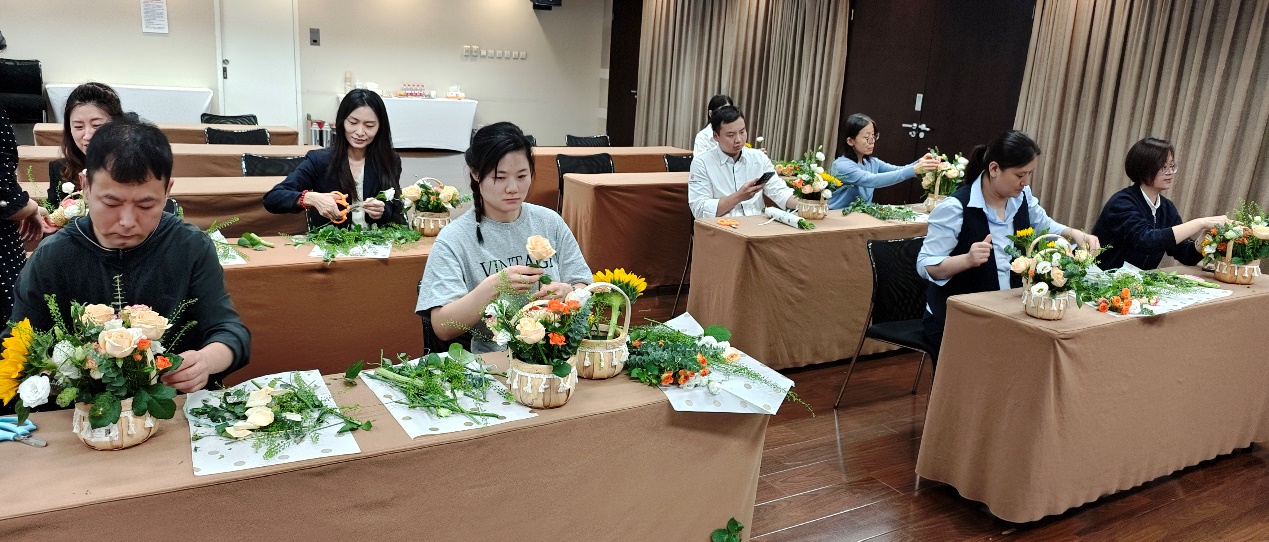 本次活动为大家精心准备了各种花材,花香洋溢在室内每个角落。花艺老师向大家细致介绍了各类花型和插花表达的意境,并亲手示范多种造型的插花,将插花艺术生动地展现在员工们面前。在老师的指导下,大家从选材、搭配到修剪、装饰,充分展示各自的审美,制作出一束束生机盎然的花艺作品。
