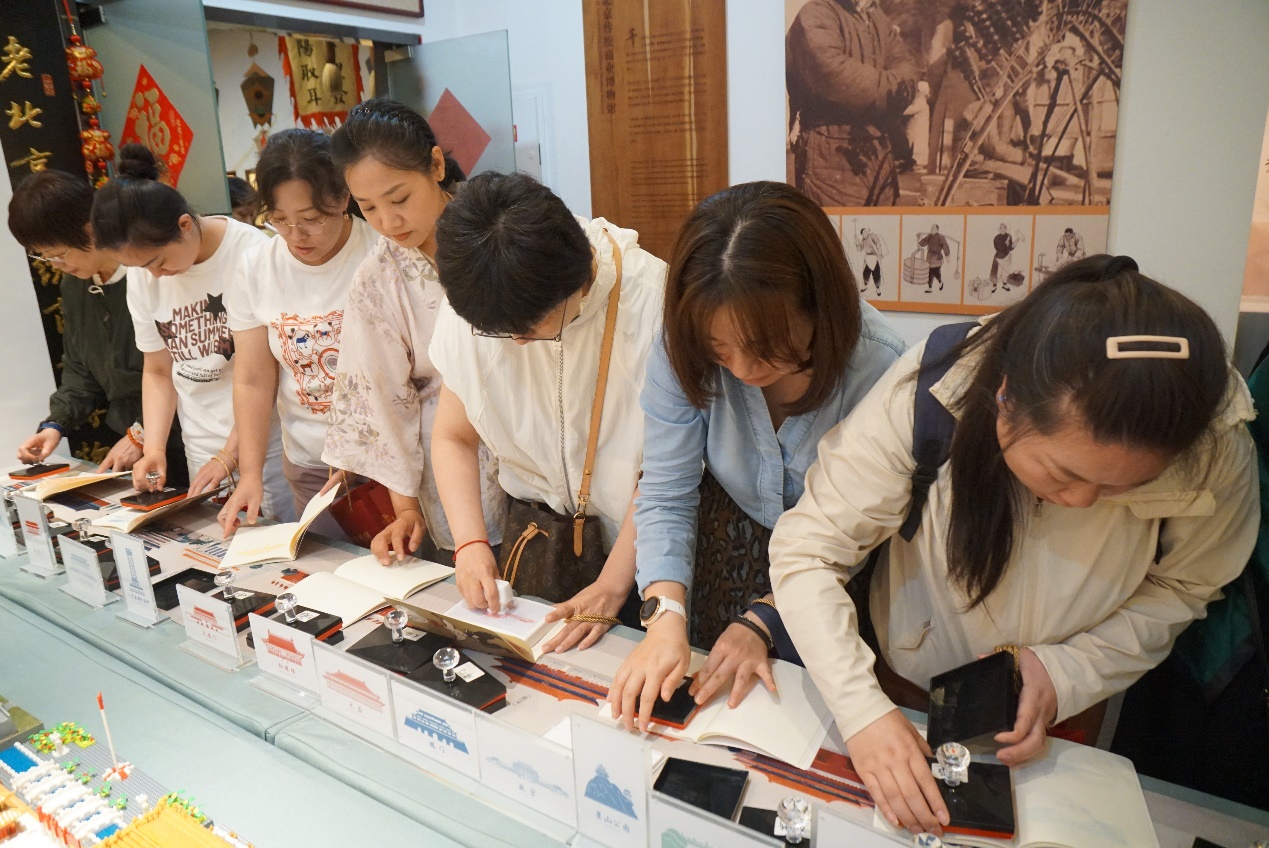 随后,大家在茶艺师的悉心指导下,沉浸式体验了宋代点茶技艺,领略非遗文化的独特魅力。从少量注水调膏,到精准量茶注汤,一边注水一边用茶筅轻轻击拂,以茶为墨,在沫饽上勾勒出独一无二的图案,创作了一场名为“茶百戏”的视觉盛宴,亲身感受中国茶文化的博大精深与艺术情趣,在袅袅茶香中领悟千年智慧。最后,在茶馆工作人员的指引下,大家还体验了老舍茶馆特色文创印章和北京中轴线套章,深刻感受中轴线建筑群的秩序美学及其蕴含的历史与文化价值。